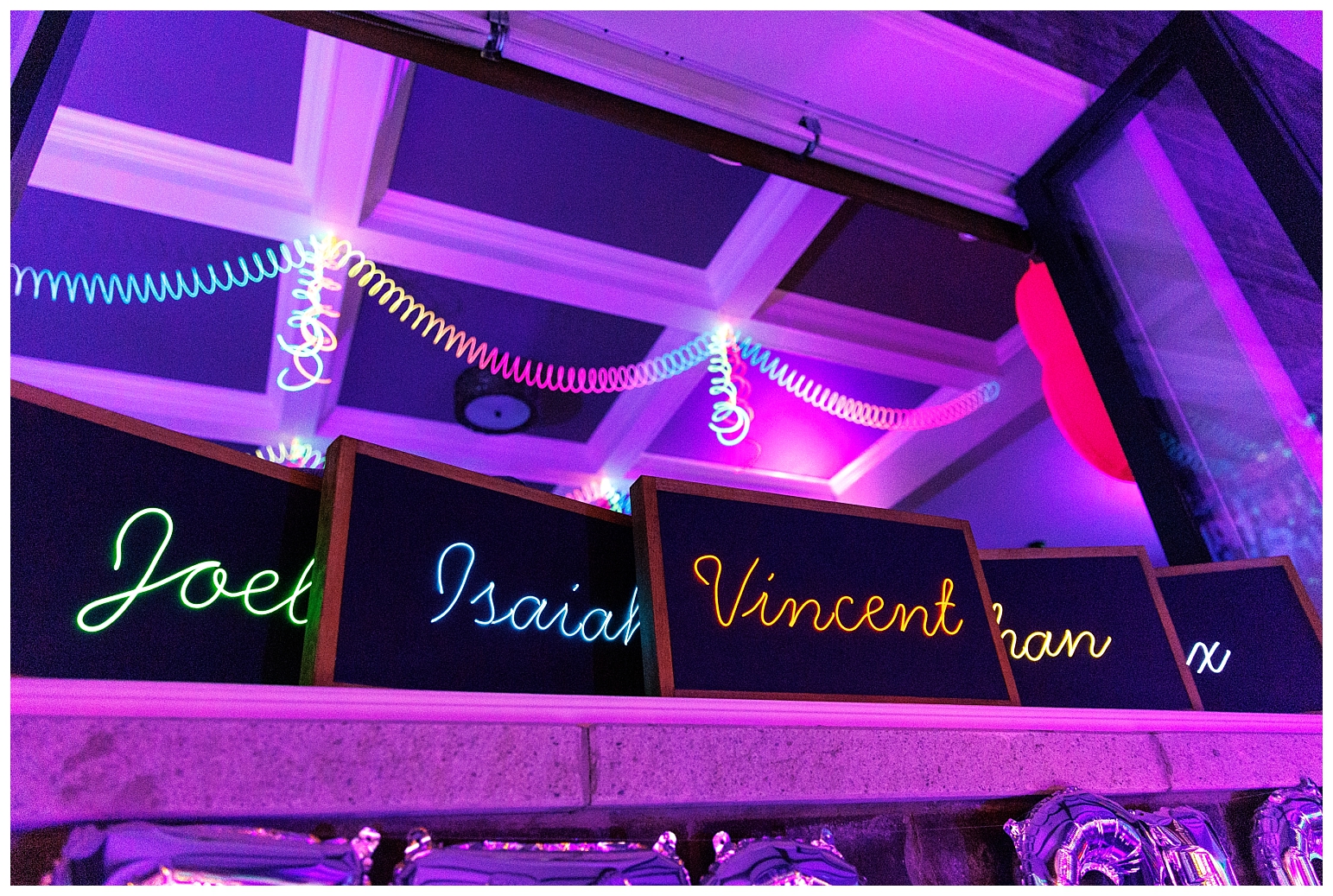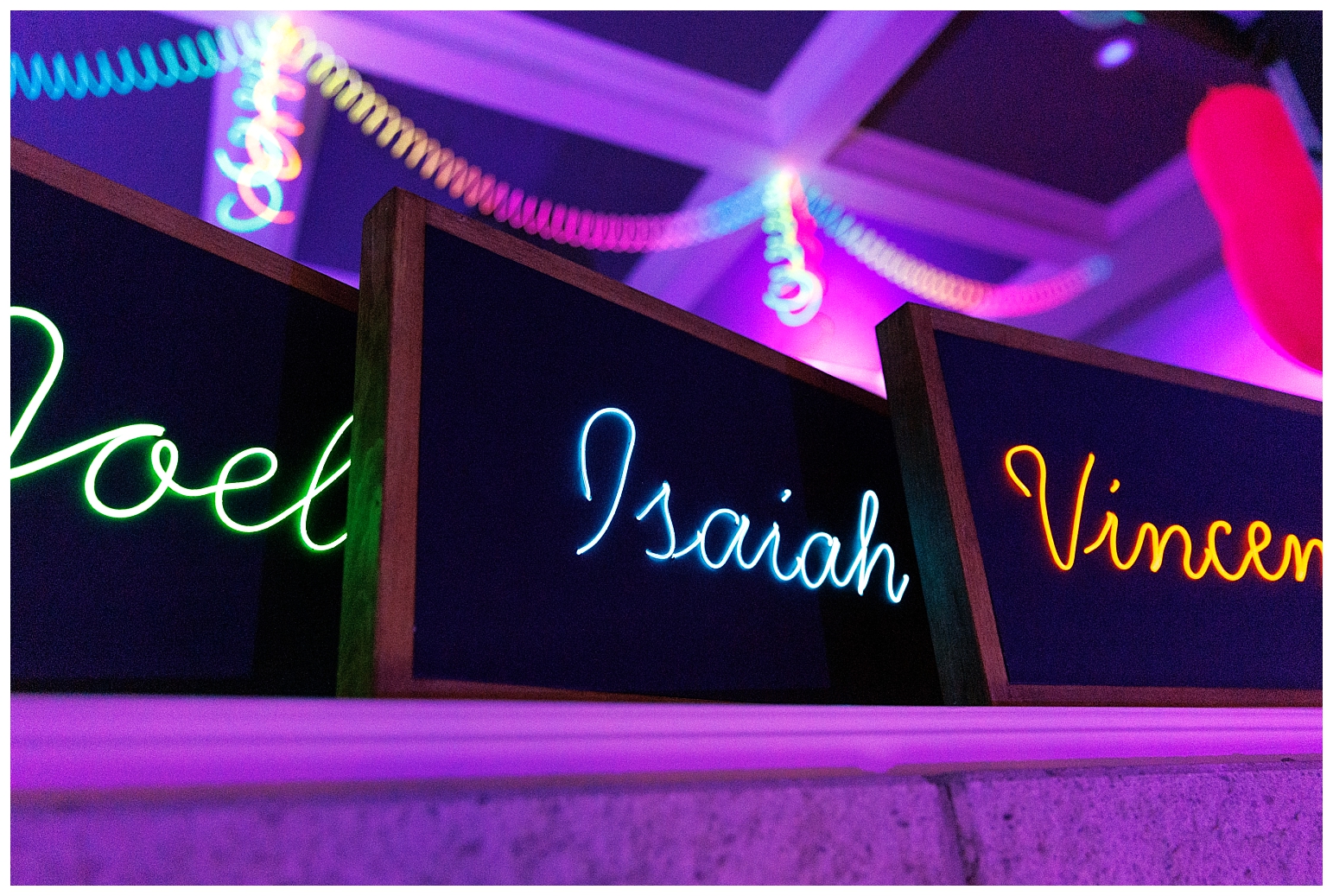 The kids’ favours were these custom neon signs that I made using EL wire. Super cool stuff!!