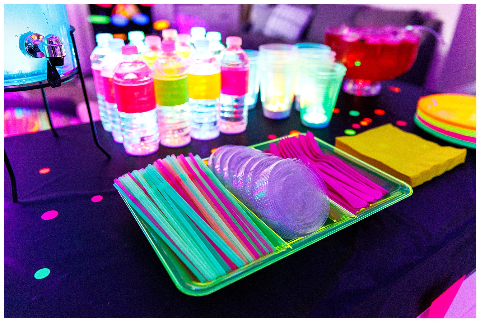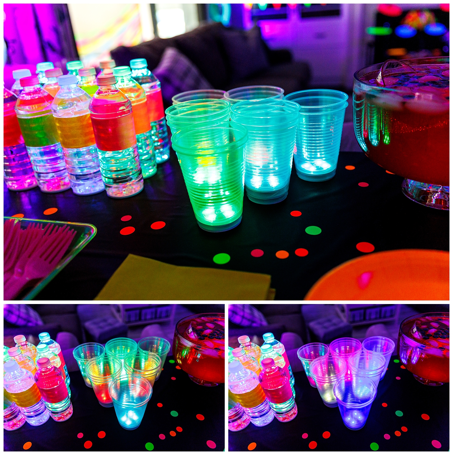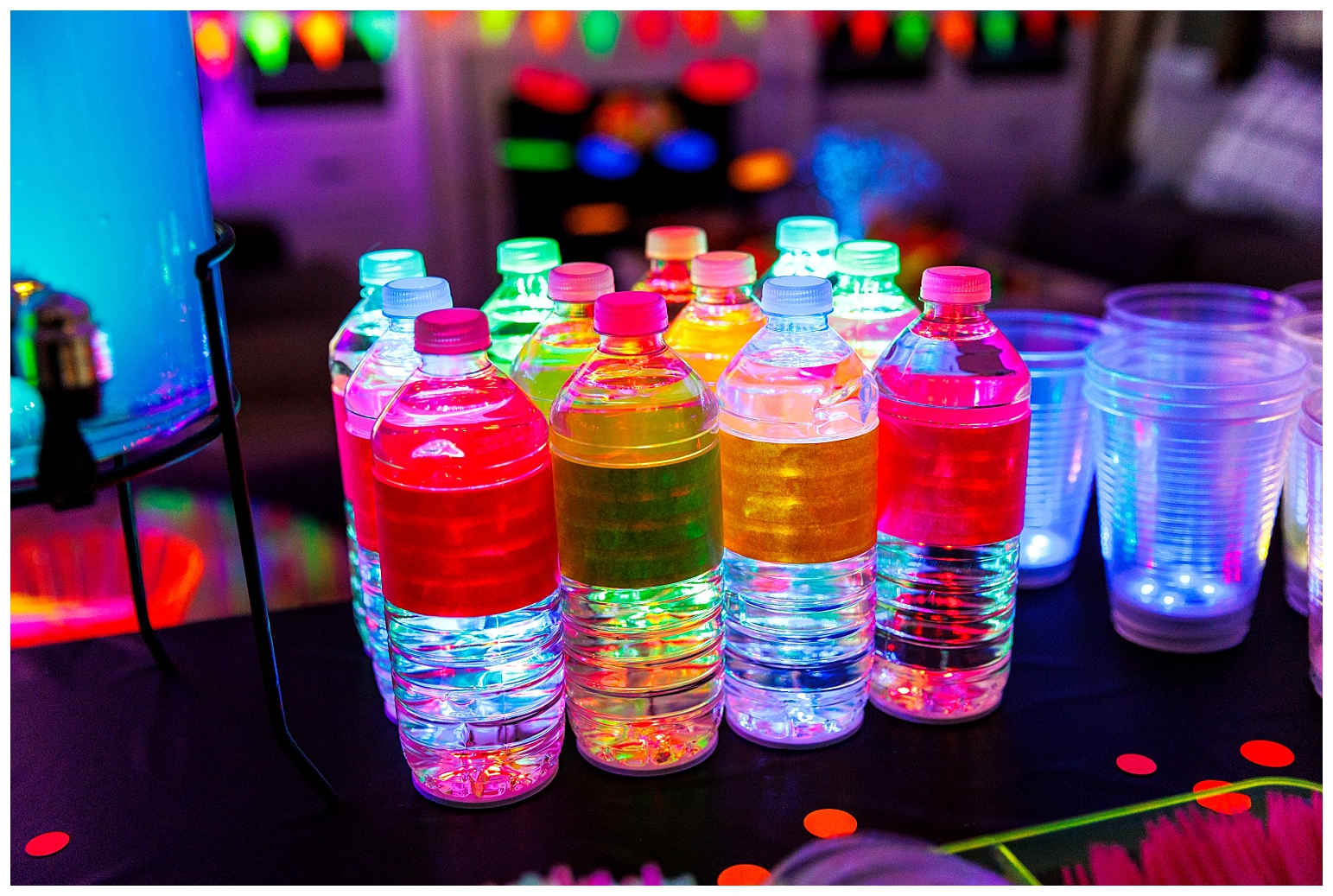 For the food, my answer was neon luster dust added to every recipe. And for the drinks my answer was led light up coasters under the drink canisters, bottled water and individual cups. Everyone could customize their light up cup colour, it was super fun!