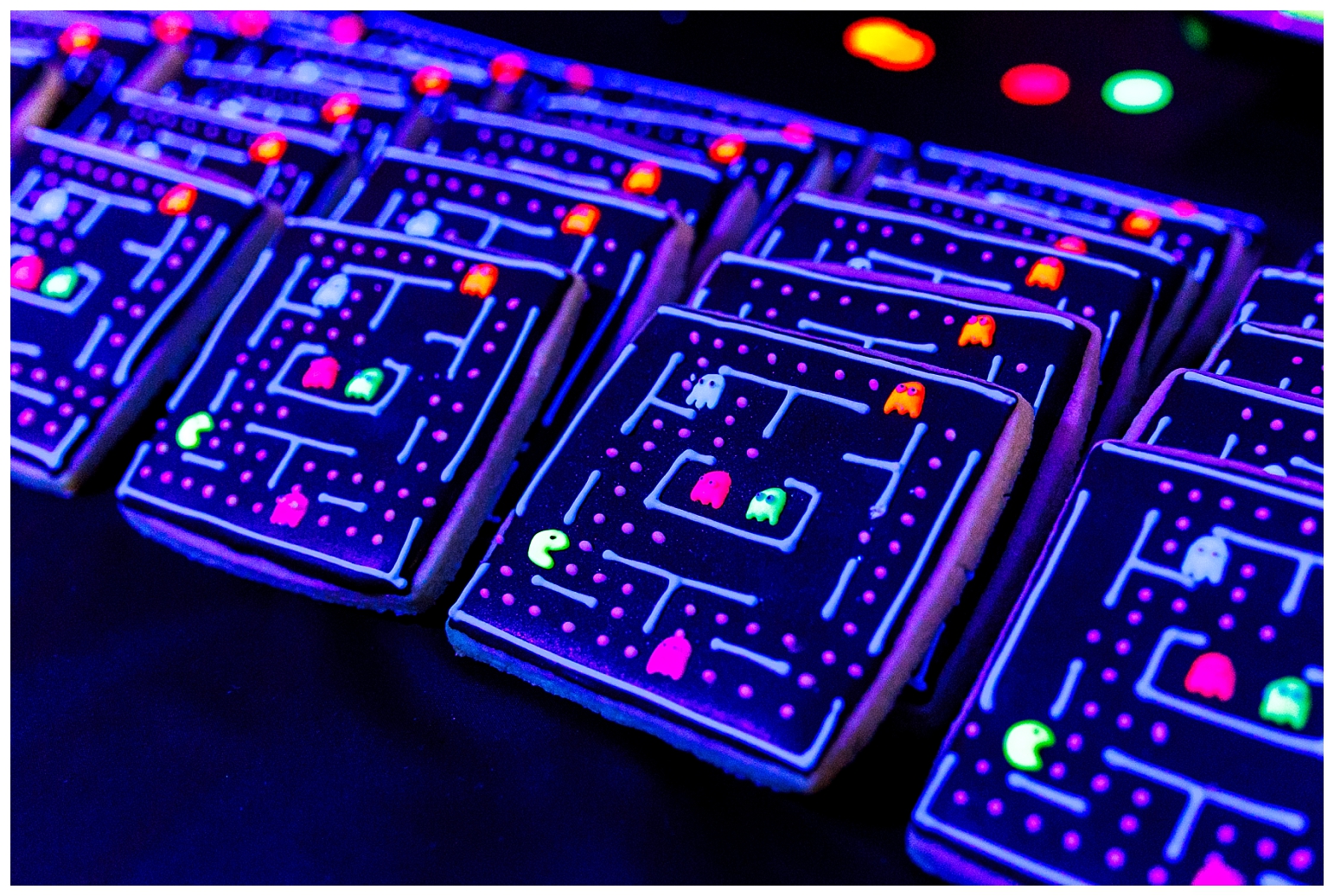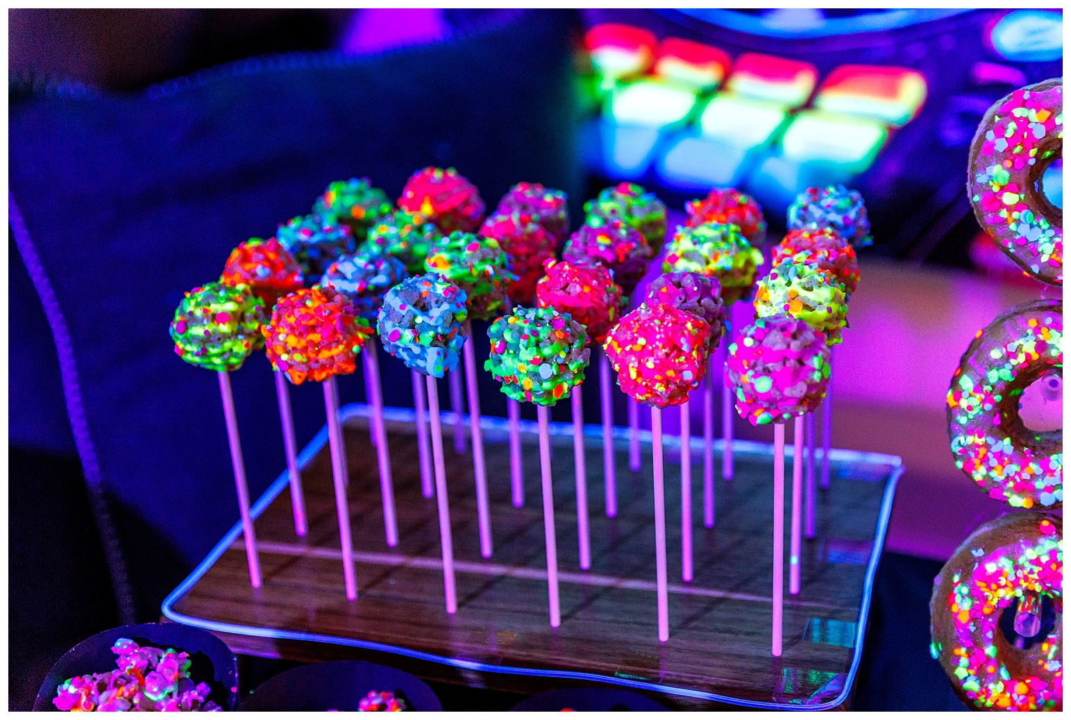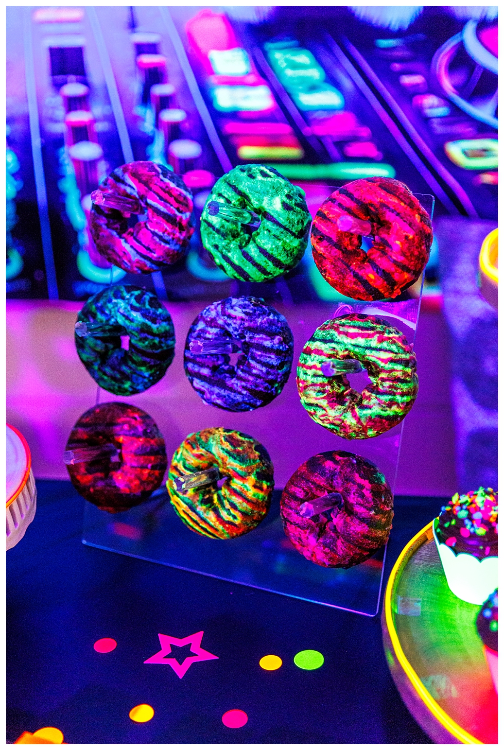 For the food, my answer was neon luster dust added to every recipe. And for the drinks my answer was led light up coasters under the drink canisters, bottled water and individual cups. Everyone could customize their light up cup colour, it was super fun!