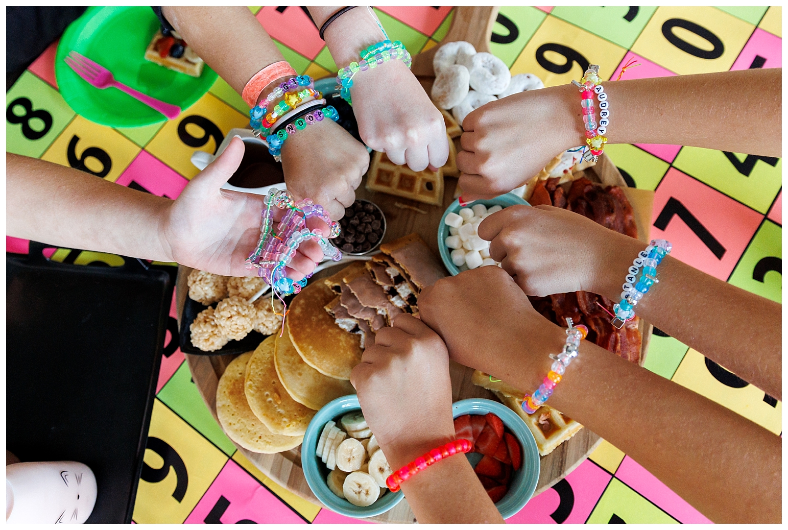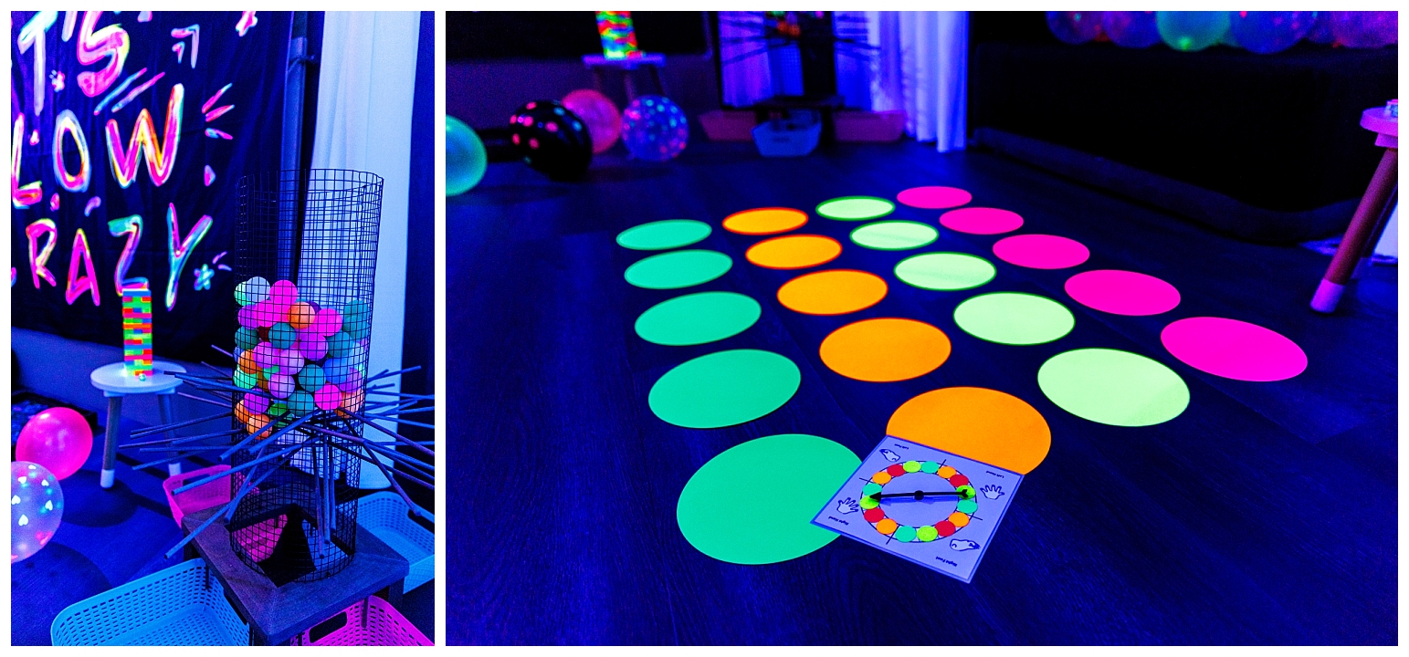 I prepped some fun activities for the girls including: glow twister, glow giant kerplunk, glow jenga, decorating their custom initial cups with neon stickers, glow nailpolish and body glitter, and glow friendship bracelet making. There was also a full snack spread and a movie setup, but they ended up having so much fun with all of the other activities the tv never even turned on. I consider that a success. 🙂